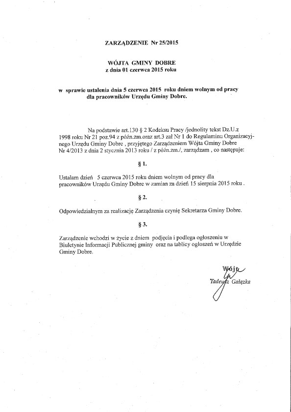 w sprawie ustalenia dnia 5 czerwca 2015 roku dniem wolnym od pracy dla pracowników Urzędu Gminy Dobre.