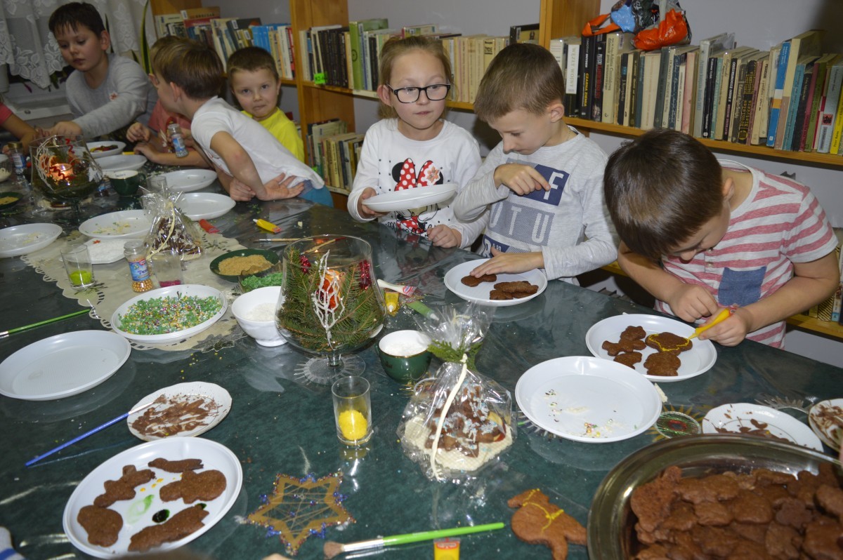 Najmłodsze dzieci z Gminy Dobre zajęły się wypiekaniem i dekorowaniem pierniczków. Zabawy przy dekoracji było mnóstwo, a zapach pierniczków ogarnął cała bibliotekę, nawet książki pachniały pierniczkami.