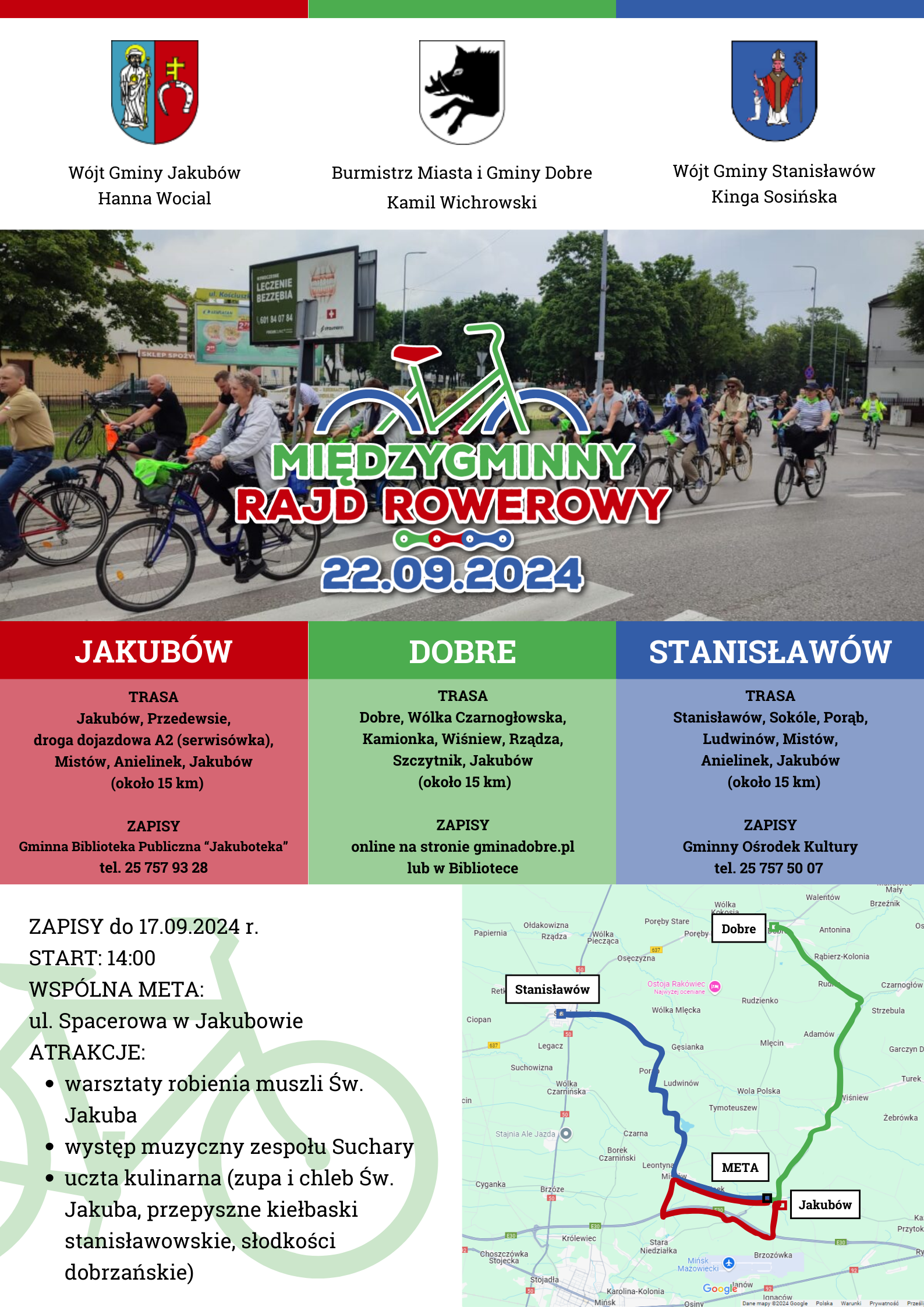 Włodarze Gmin Jakubów, Dobre i Stanisławów zapraszają na Międzygminny Rajd Rowerowy z metą w Jakubowie. To będzie doskonała okazja, by poznać nowych ludzi, spotkać się z przyjaciółmi i przede wszystkim, wspólnie cieszyć się pasją do jazdy na rowerze.