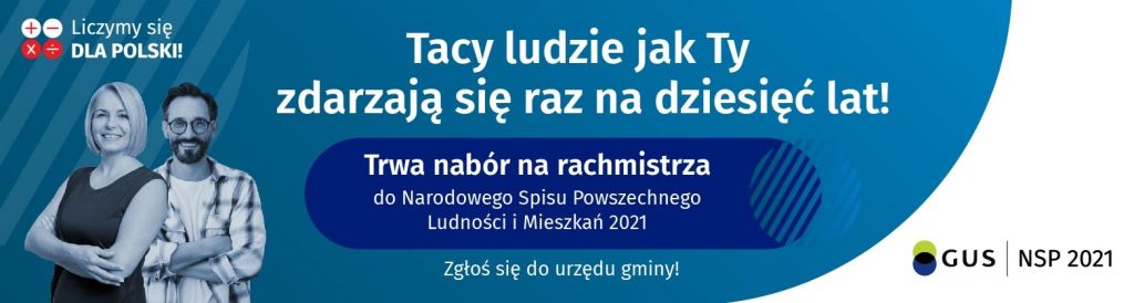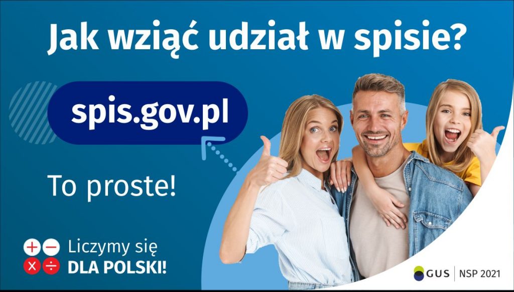 Na górze grafiki jest napis: Narodowy Spis Powszechny Ludności i Mieszkań 2021. Poniżej widać pięć kół, na których umieszczone są napisy: Maturzysto, jesteś pełnoletni, więc możesz się spisać! To Twój pierwszy obywatelski obowiązek! Wypełnij formularz na stronie spis.gov.pl. Kolejna taka szansa dopiero za dziesięć lat! Na ostatnim kole są cztery małe kółka ze znakami dodawania, odejmowania, mnożenia i dzielenia, obok nich napis: Liczymy się dla Polski! Na dole grafiki widać kilka siedzących młodych osób, wokół których rozłożone są zeszyty, artykuły biurowe, plecaki, laptop. W prawym dolnym rogu jest logotyp spisu: dwa nachodzące na siebie pionowo koła, GUS, pionowa kreska, NSP 2021.
