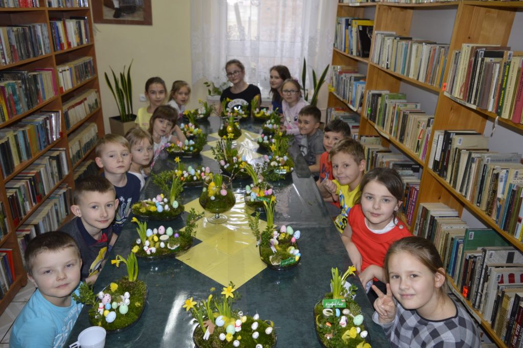 28 marca w Czytelni Gminnej Biblioteki grupa dzieci dekorowały świąteczne ciasteczkowe jajka, baranki i kurczaczki.