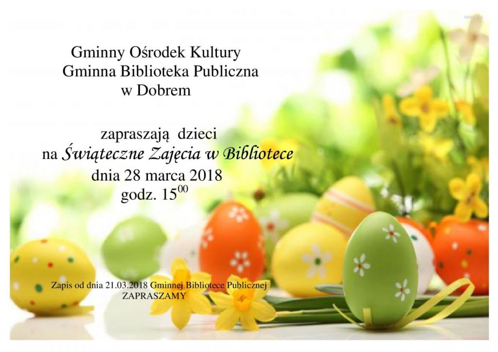 Gminny Ośrodek Kultury i Biblioteka w Dobrem zapraszają dorosłych na Świąteczne Zajęcia dnia 13 kwietnia 2019 o godz. 15:00.