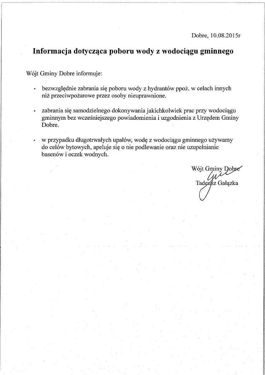 W związku z wysokimi temperaturami powietrza oraz napływającą falą upałów i suszą, zwracam się do mieszkańców gminy Dobre z apelem o oszczędne gospodarowanie wodą, a szczególnie nie podlewanie trawników i ogródków przydomowych.