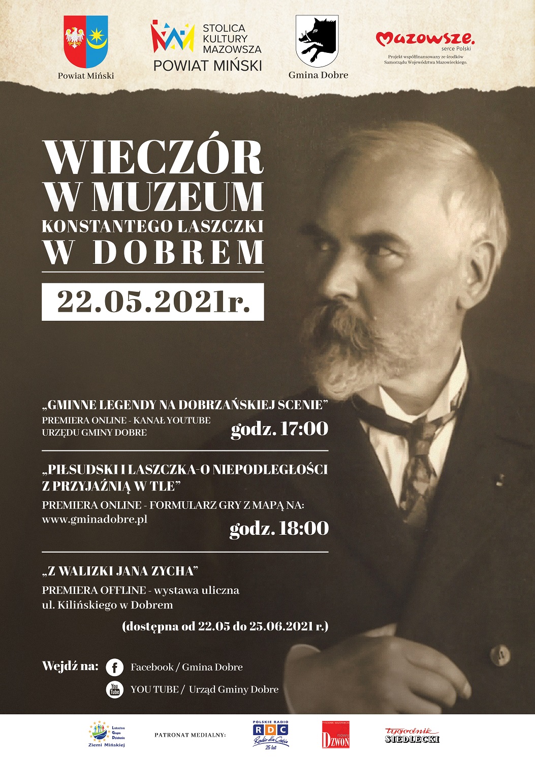 Serdecznie zapraszamy na „Wieczór w Muzeum Konstantego Laszczki w Dobrem”. Premiera on-line 22 maja o godz. 17:00 na: Facebook/ Gmina Dobre i YouTube/Urząd Gminy Dobre. Wiecej szczegółów wydarzenia na plakacie.